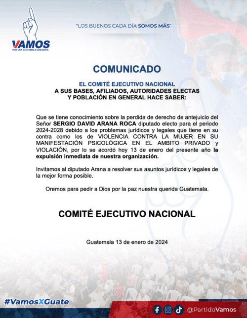 A pesar de que el partido Vamos anunció la expulsión inmediata de Arana en un comunicado del Comité Ejecutivo Nacional, aún figura como miembro del bloque en el Legislativo. Sin embargo, se confirma que ya no forma parte de los allegados a Allan Rodríguez, quien dirige la bancada.