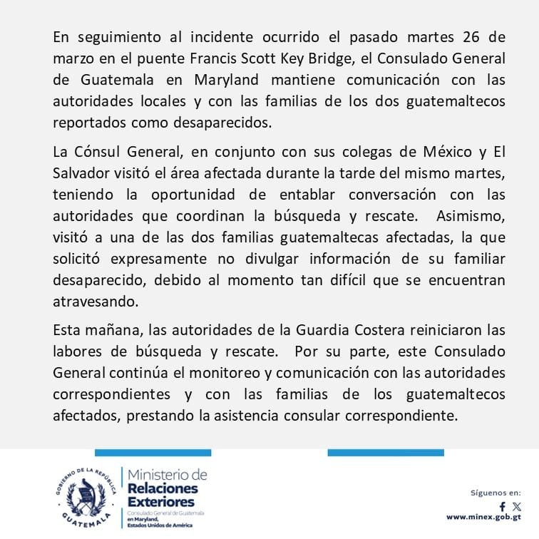 Por medio de un comunicado de prensa, el Consulado General de Guatemala en Maryland, informó que se está dando seguimiento al incidente ocurrido el pasado martes 26 de marzo en el puente Francis Scott Key Bridge.