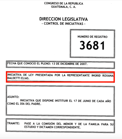 No es la primera vez que se presenta una propuesta para reconocer el Día del Padre como asueto oficial en Guatemala. En los últimos 25 años, se han presentado al menos tres iniciativas similares en el Congreso. La primera, datada en 1998, buscaba establecer el 17 de junio como el Día del Padre de familia guatemalteco. Nueve años después, la exvicepresidenta Roxana Baldetti intentó nuevamente instituir la celebración mediante una ley. La propuesta más reciente, presentada por Fidel Reyes Lee en abril de 2016, no solo busca institucionalizar la conmemoración sino también otorgar asueto con goce de salario a los padres trabajadores.