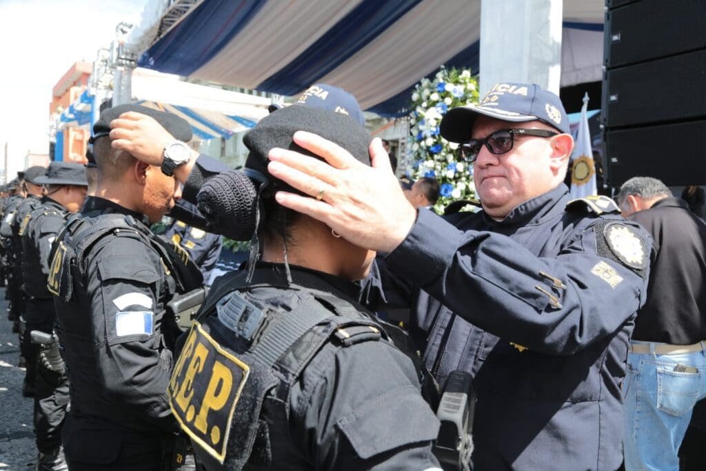 Durante el acto. De entrega de vehículos y armas, la Escuela de Dirección de la PNC realizó la imposición de boinas a los efectivos policiales que concluyeron el curso del Grupo de Acción Rápida, GAR, y de Fuerzas Especiales de Policía, FEP, 20 agentes del GAR y 96 agentes de las FEP, recibieron ascensos.
