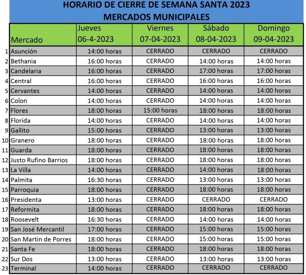 “Es importante que la población conozco los horarios de cierre y realicen sus compras sin contratiempos durante la Semana Santa 2023. El jueves será irregular el servicio, es decir no todos atenderán hasta las 18:00 horas”,