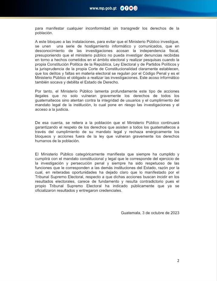 De esa cuenta, se reitera a la población que el Ministerio Público continuará garantizando el respeto de los derechos que asisten a todos los guatemaltecos a través del cumplimiento de su mandato legal y rechaza enérgicamente los bloqueos y acciones fuera de la ley que vulneran gravemente los derechos humanos de la población.