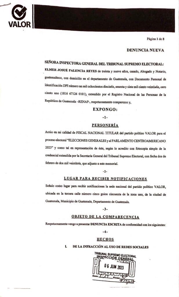 Elmer Palencia, Fiscal General del partido Valor, exigió a los Magistrados del Tribunal Supremo Electoral, TSE, resolver la denuncia en contra de Mulet.