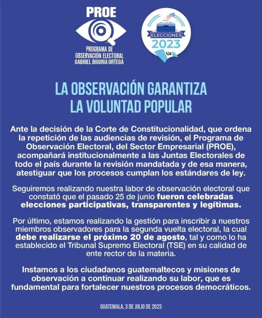 Ante la decisión de la Corte de Constitucionalidad, que ordena la repetición de las audiencias de revisión, el Programa de Observación Electoral, del Sector Empresarial, PROE, acompañará institucionalmente a las Juntas Electorales de todo el país durante la revisión mandatada y de esa manera, atestiguar que los procesos cumplan los estándares de ley.