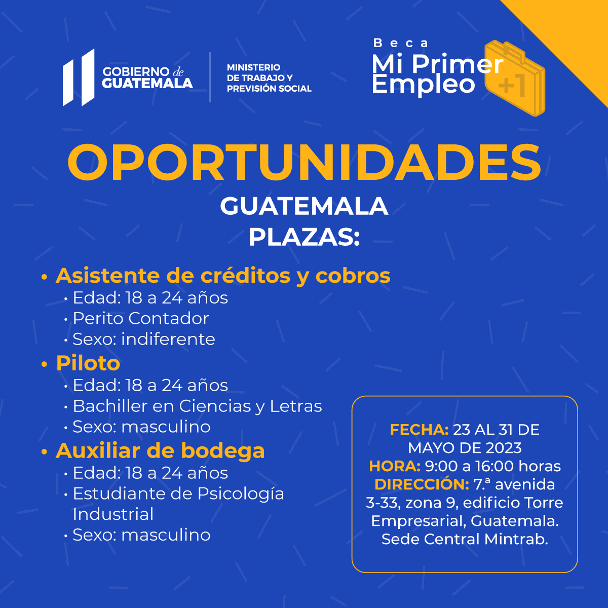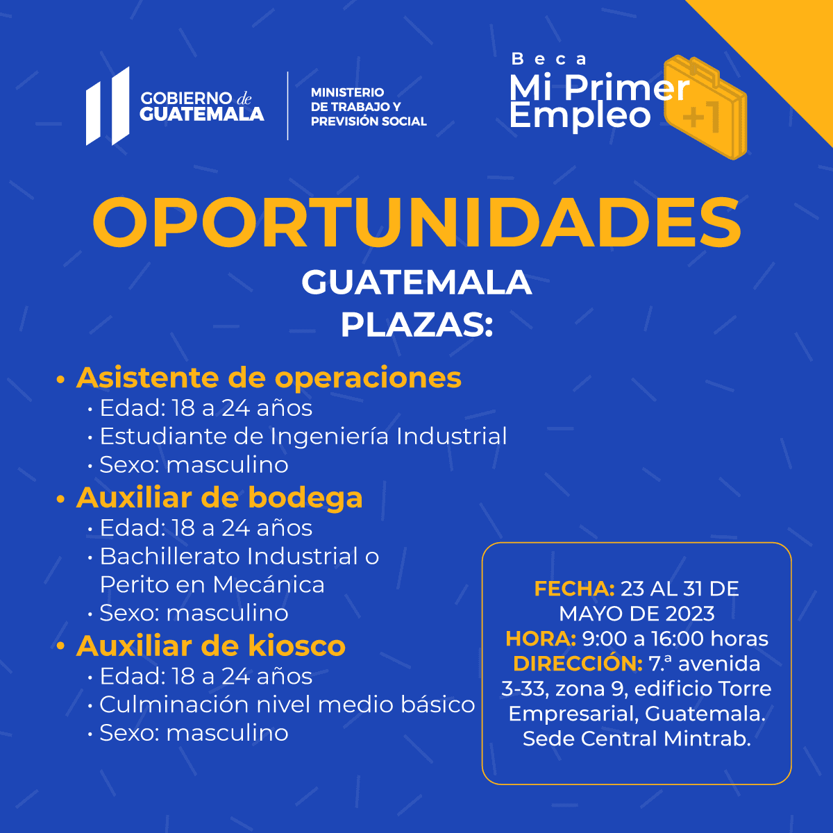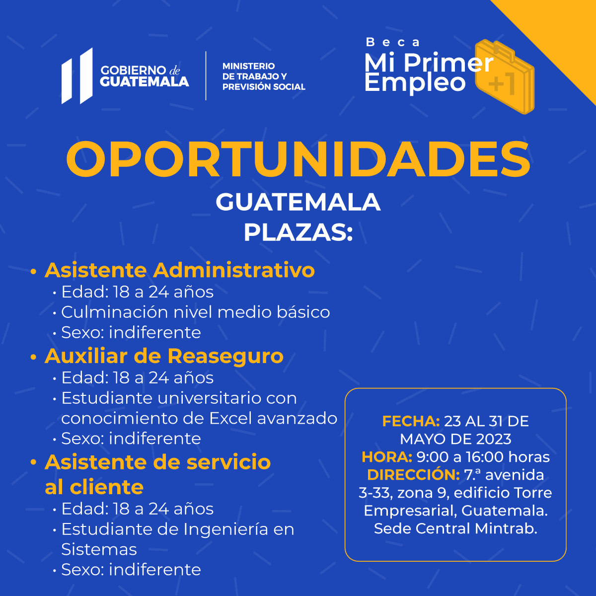 Autoridades del Ministerio de Trabajo y Previsión Social, Mintrab, invita a jóvenes de 18 a 24 años residentes del departamento de Guatemala a participar en oportunidades laborales en el programa Beca Mi Primer Empleo.