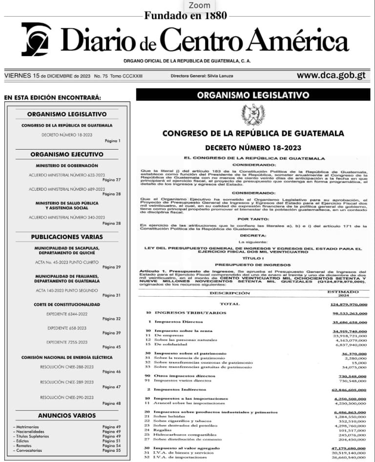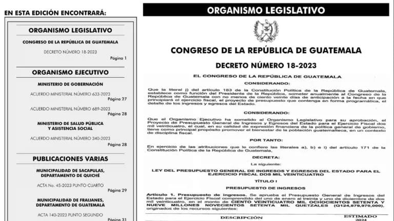 El día de hoy, viernes 15 de diciembre, ha sido publicado en el diario oficial el decreto número 18-2023, correspondiente a la Ley del Presupuesto General de Ingresos y Egresos del Estado para el ejercicio fiscal 2024. Este decreto, que ha sido firmado por el presidente Alejandro Giammattei, el ministro de Finanzas, Edwin Martínez, y la secretaria general de la Presidencia, María Ramírez, establece un monto total de 124 mil 879 millones 970 mil quetzales.