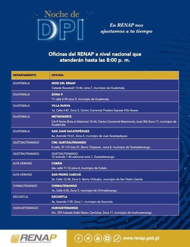 Las oficinas que ofrecerán este horario extendido se encuentran en diferentes localidades, incluyendo la zona 7 y zona 9 de la capital, Villa Nueva, Metronorte (zona 17), Quetzaltenango, Cobán, Chimaltenango, San Pedro Carchá, Escuintla, San Juan Sacatepéquez, Huehuetenango y más. La ubicación exacta de cada punto de atención se puede encontrar en el sitio web oficial del Renap.
