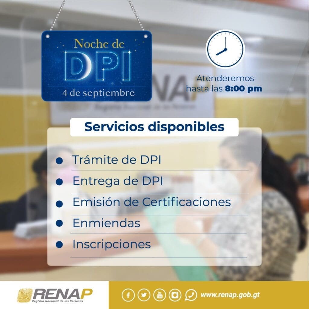 El Registro Nacional de las Personas (Renap) de Guatemala anunció que el próximo lunes se llevará a cabo la primera “Noche de DPI” del mes, una iniciativa destinada a brindar mayor accesibilidad a los ciudadanos para gestionar sus Documentos Personales de Identificación (DPI).