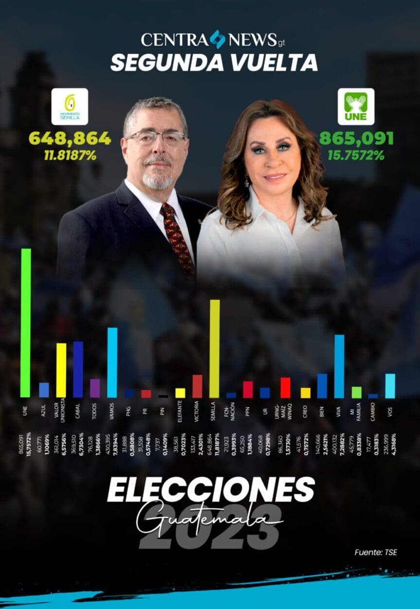 Sandra Torres del Partido Político UNE y Bernardo Arévalo de Semilla van a una segunda vuelta electoral para ocupar la primera Magistratura de la nación.
