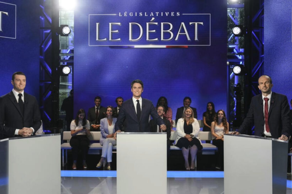 El primer ministro francés, Gabriel Attal, Jordan Bardella, presidente de la Agrupación Nacional (RN, extrema derecha) y Manuel Bompard, de la coalición de izquierdas Nuevo Frente...