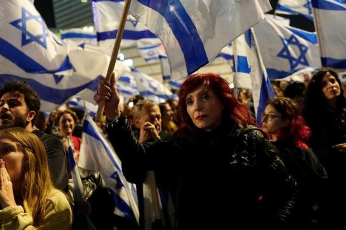 Portando banderas israelíes, la gente marchó por el centro del eje comercial de Israel, coreando “democracia” y portando pancartas de condena al gobierno de extrema derecha...