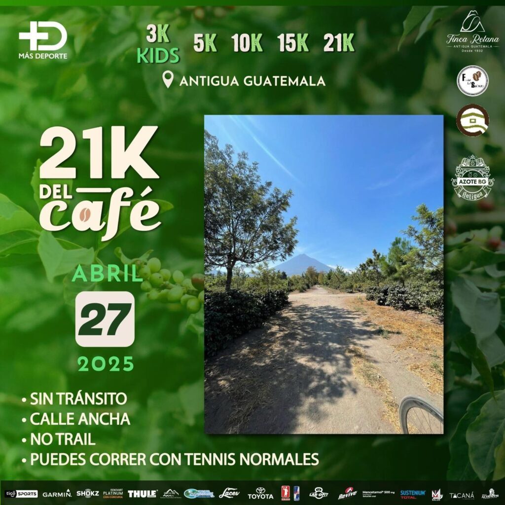La Carrera 21K del Café en Antigua Guatemala se llevará a cabo el 27 de abril a las 7:00 a. m., con salida y meta en Finca La Azotea, recorriendo Finca Salinas y Finca Retana. Es un evento sin límite de edad que promueve el deporte, la vida saludable y la unión familiar.