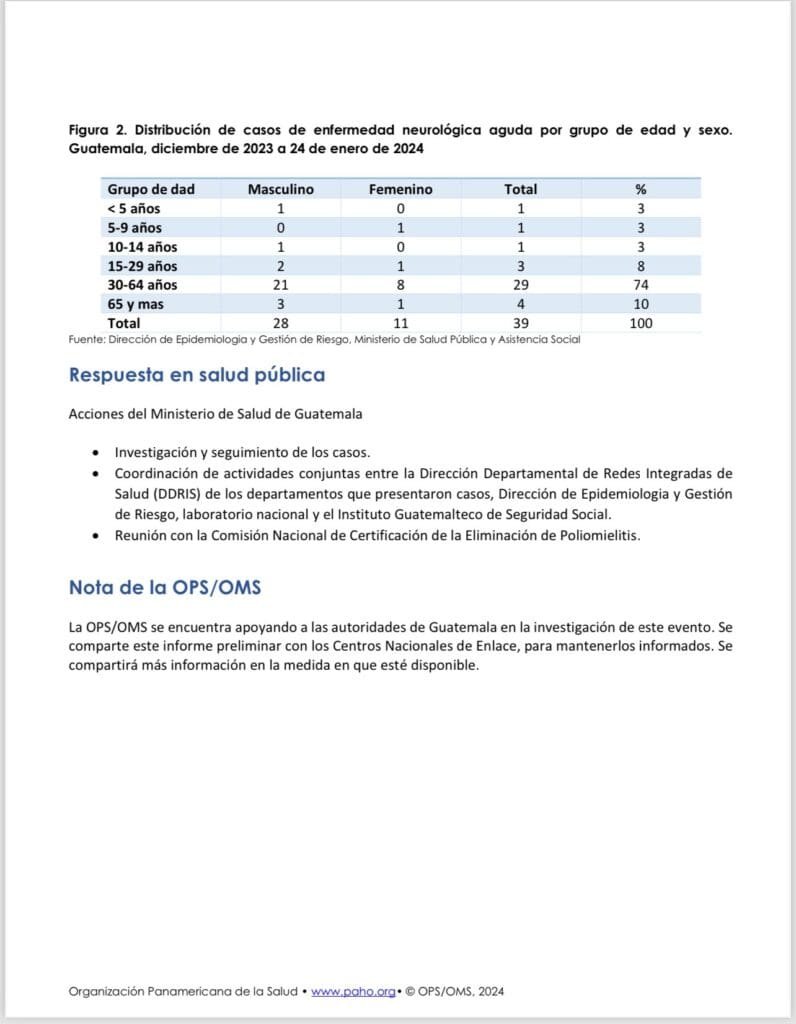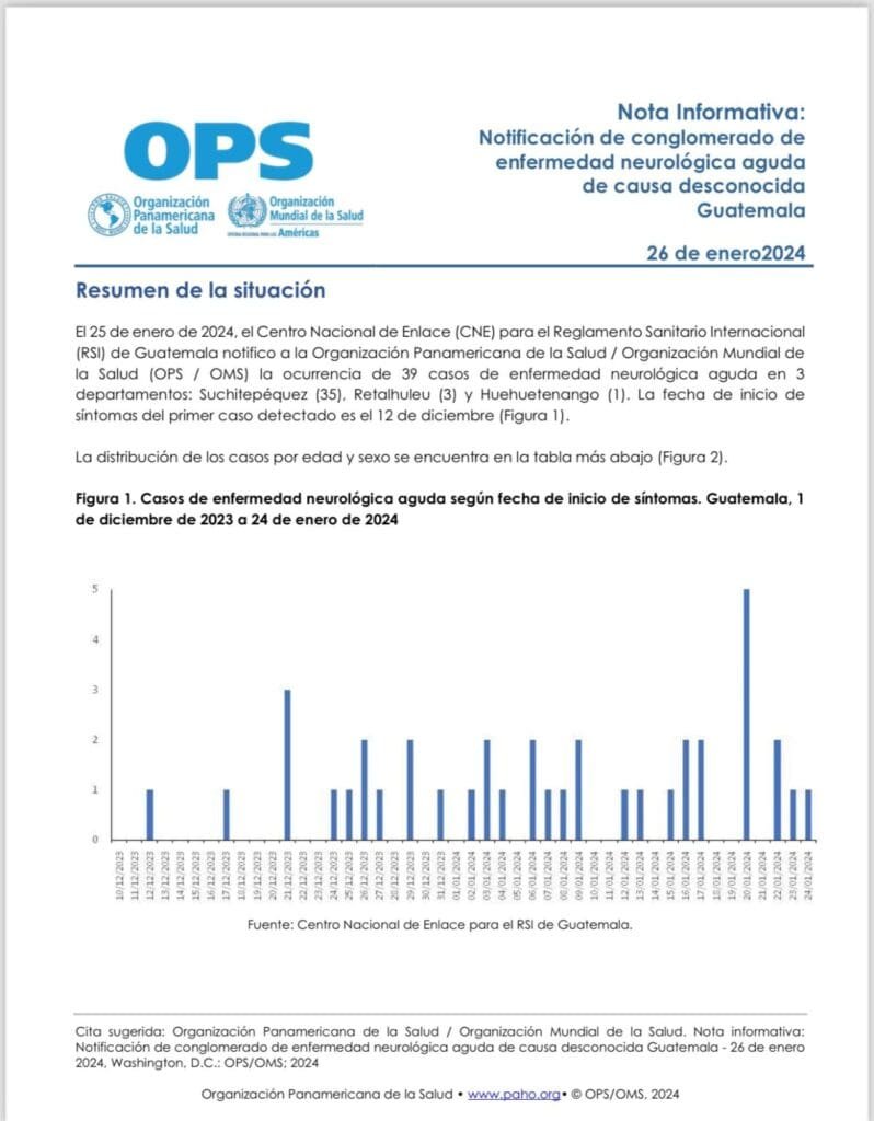 Según la OPS, el 25 de enero, las autoridades de salud de Guatemala notificaron un total de 39 casos de enfermedad neurológica aguda en tres departamentos del país: Suchitepéquez con 35 casos, Retalhuleu con 3 y Huehuetenango con 1. Aunque estos casos comenzaron a reportarse en la primera semana epidemiológica del año 2024, la fecha de inicio de síntomas del primer caso identificado se remonta al 12 de diciembre del año anterior.